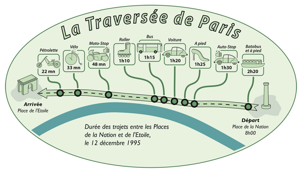 Illustration pour représenter la durée nécessaire pour traverser Paris selon les moyens de déplacement.